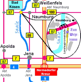 Mit dem Auto erreichen Sie uns aus westlicher Richtung über die A4 Abfahrt Apolda oder Jena oder von Süden, Norden oder Osten kommend auf der A9 Abfahrt Naumburg. Aus Naumburg kommend biegen Sie in Bad Kösen vor der Fußgängerampel links ab und fahren noch 100 m. Kommen Sie aus westlicher Richtung, so biegen Sie nach der Saale-Brücke und der Ampel nach rechts ab.